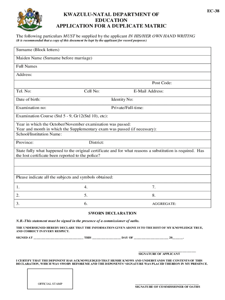 Get the free Application for Duplicate Matric Certificate