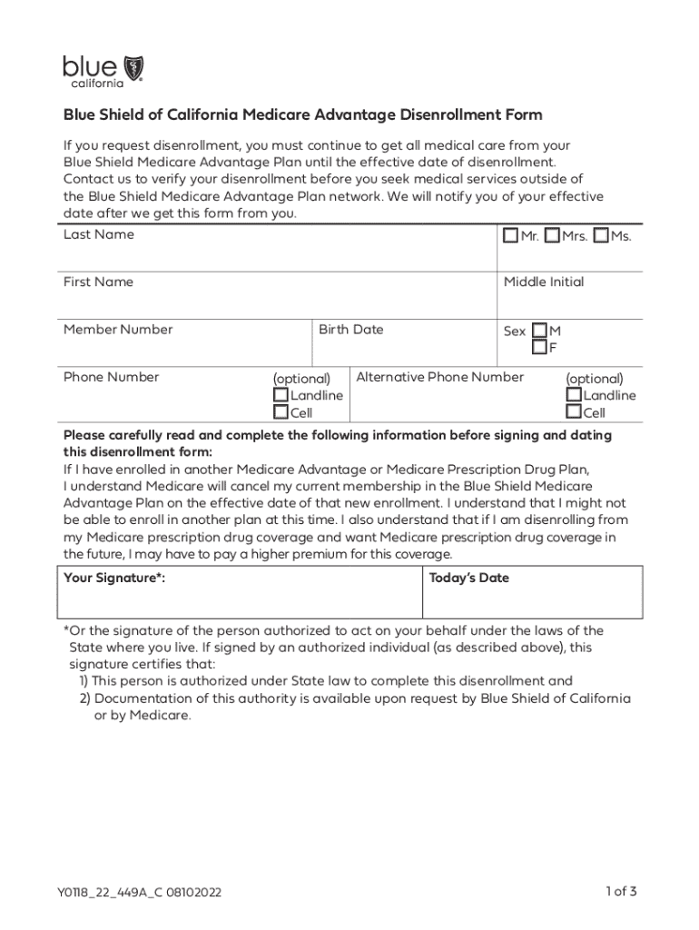 Get the free Blue Shield Medicare Advantage Disenrollment Form
