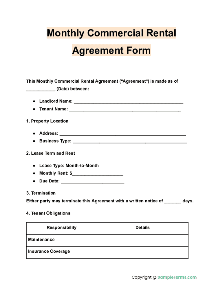 Understanding the differences between a monthly commercial rental agreement and other forms of rental agreements, such as those with fixed terms, is crucial. Monthly agreements offer more adaptability, enabling tenants to adjust more readily to evolving business needs.