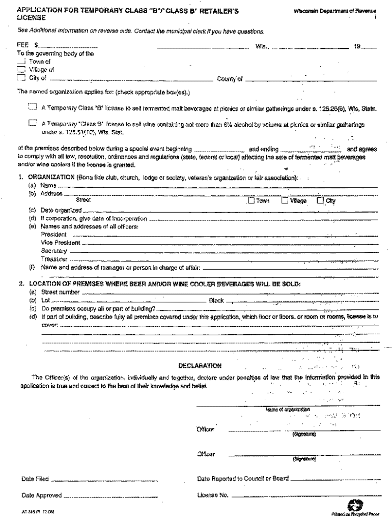 Get the free Wisconsin Temporary Class B License Application