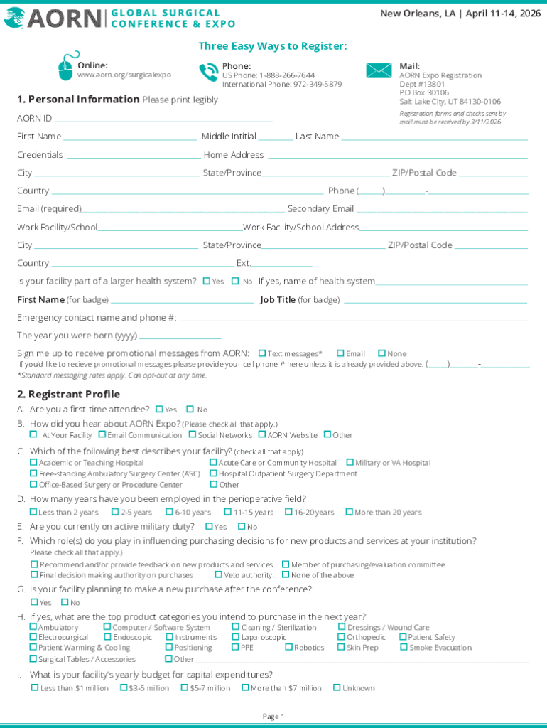 The AORN Expo registration form is essential for various target audiences. This includes professionals in the nursing field, such as registered nurses and surgical team members, who are attending the expo to gain insights and knowledge.