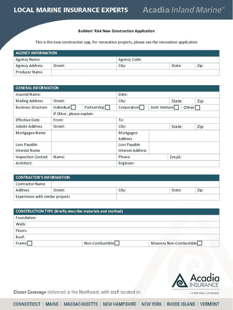 While specific deadlines may vary by project and insurer, it is best practice to complete the Builders Risk New Construction form before beginning any construction activities to ensure coverage is in effect throughout the project.