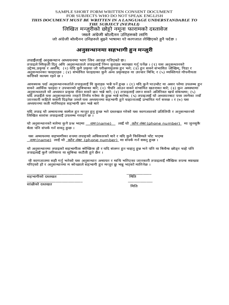 The Nepali Research Consent Form plays a crucial role in the research process, ensuring that all participants are well-informed about the study's nature, objectives, and potential risks. By using this form, researchers can protect participants' rights and privacy, fostering an environment of trust.
