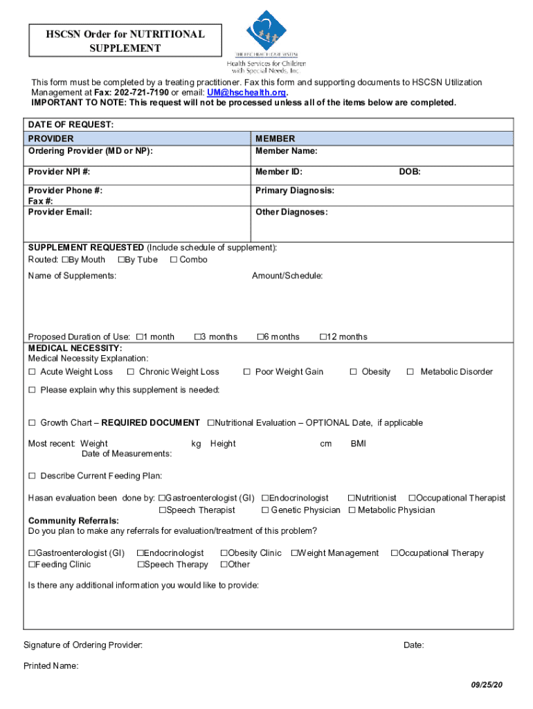 Typically, a signed physician’s order and any previous dietary assessments may be required to be attached when submitting the HSCN Order for Nutritional.