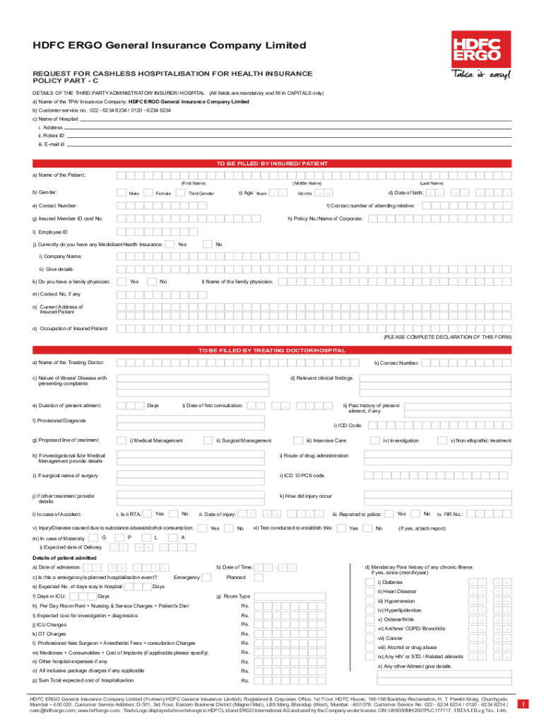 Get the free HDFC ERGO Cashless Hospitalization Request Form