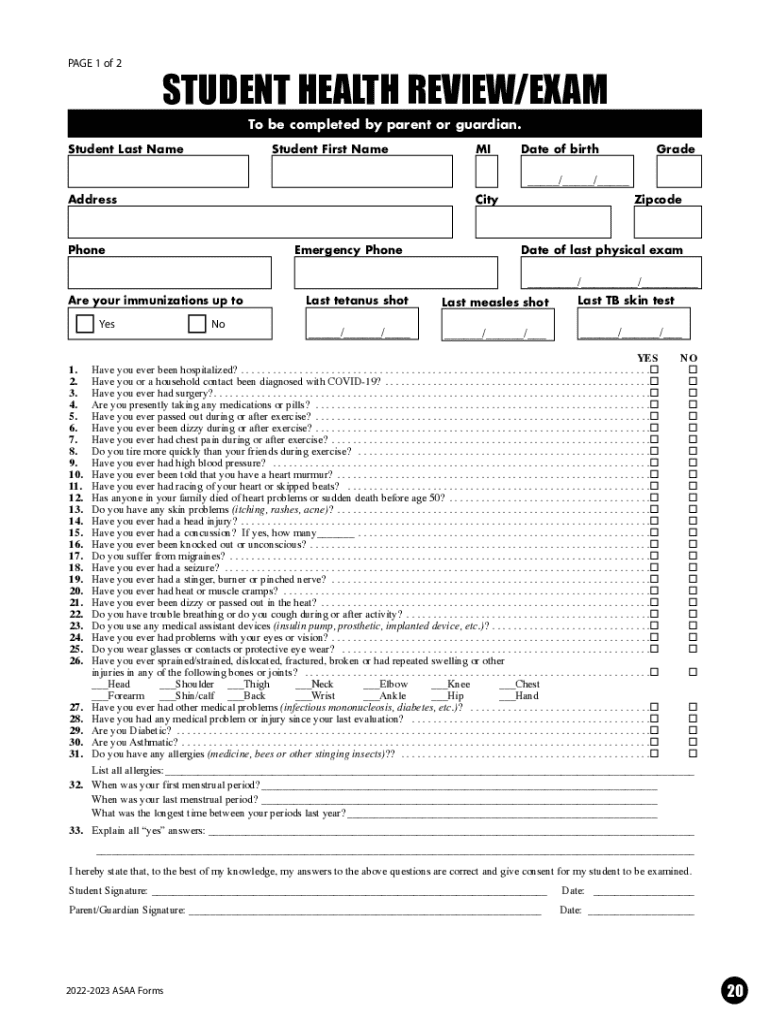 The student health review exam consists of various sections designed to capture critical information. Key features include: