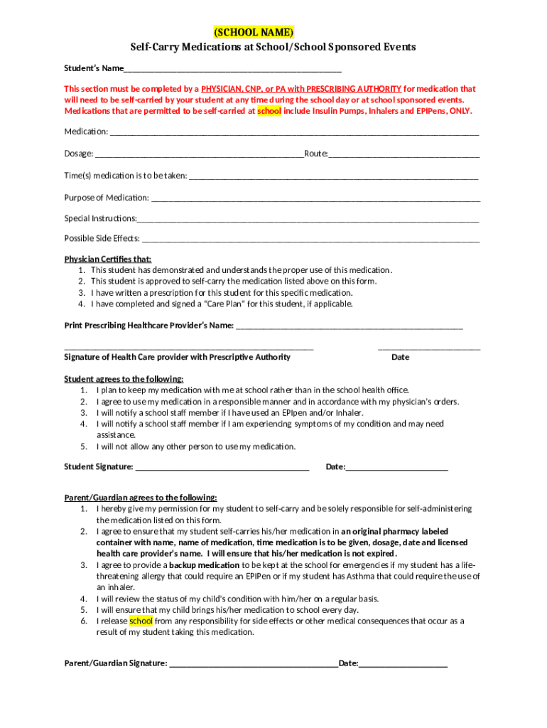 Access the Self-Carry Medications at School Form online through a secure platform.