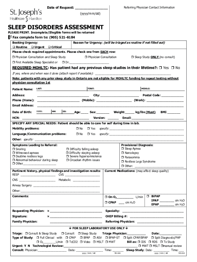 The sleep disorders assessment form is a document used by healthcare providers to evaluate patient sleep issues and conditions.