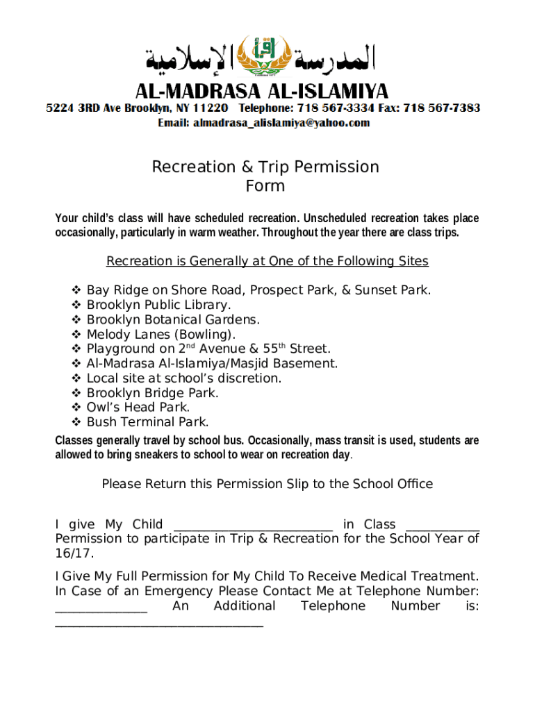 Once completed, the Recreation and Trip Permission must be submitted according to the specified guidelines of the organization overseeing the activity. Common submission methods include: