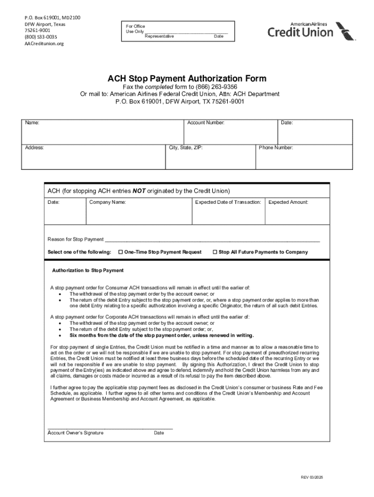 The ACH Stop Payment Authorization is a vital document that allows account holders to prevent unauthorized transactions within the Automated Clearing House (ACH) system. This form serves the critical function of halting payments that a user did not authorize, protecting both individual and business interests against fraudulent activities. Understanding its importance is essential for anyone engaged in transactions where unauthorized payments could occur.