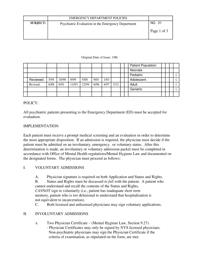 SUBJECT:Psychiatric Evaluation in the Emergency Department NO. 21Page 1 of 3Original Date of Issue: 1/86Reviewed: