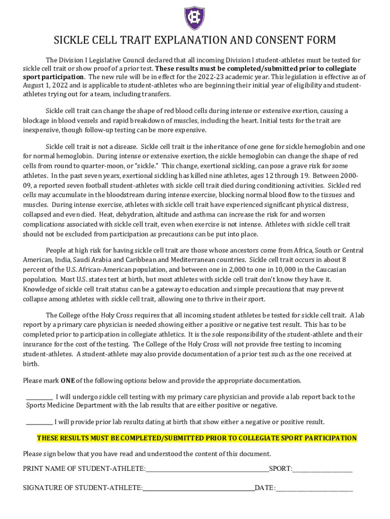 The Sickle Cell Trait Consent is a medical form used by individuals to acknowledge and consent to the testing and implications of sickle cell trait screening.