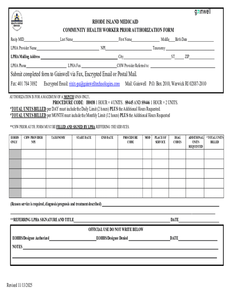 Get the free Rhode Island Medicaid Community Health Worker Prior Authorization Form