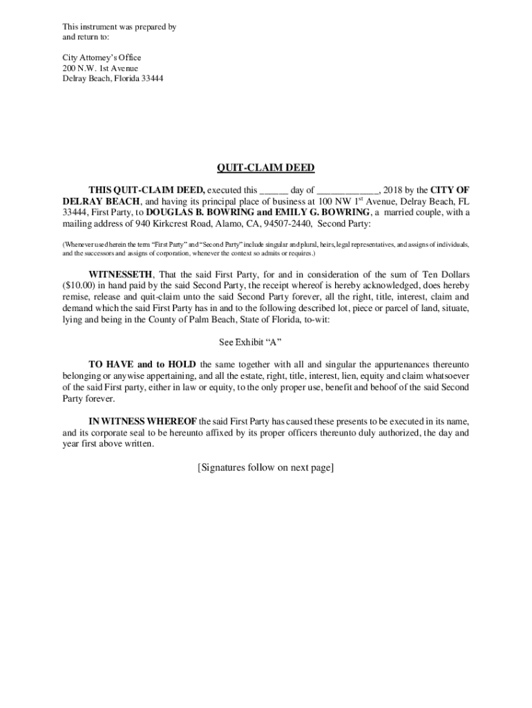 The quit-claim deed is a legal document used by property owners to transfer their interest in real estate to another party without guaranteeing that the title is clear.