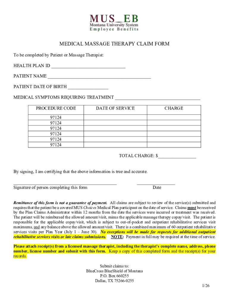 The medical massage therapy claim form is a crucial document used by patients to request reimbursement for massage therapy services covered by their insurance.