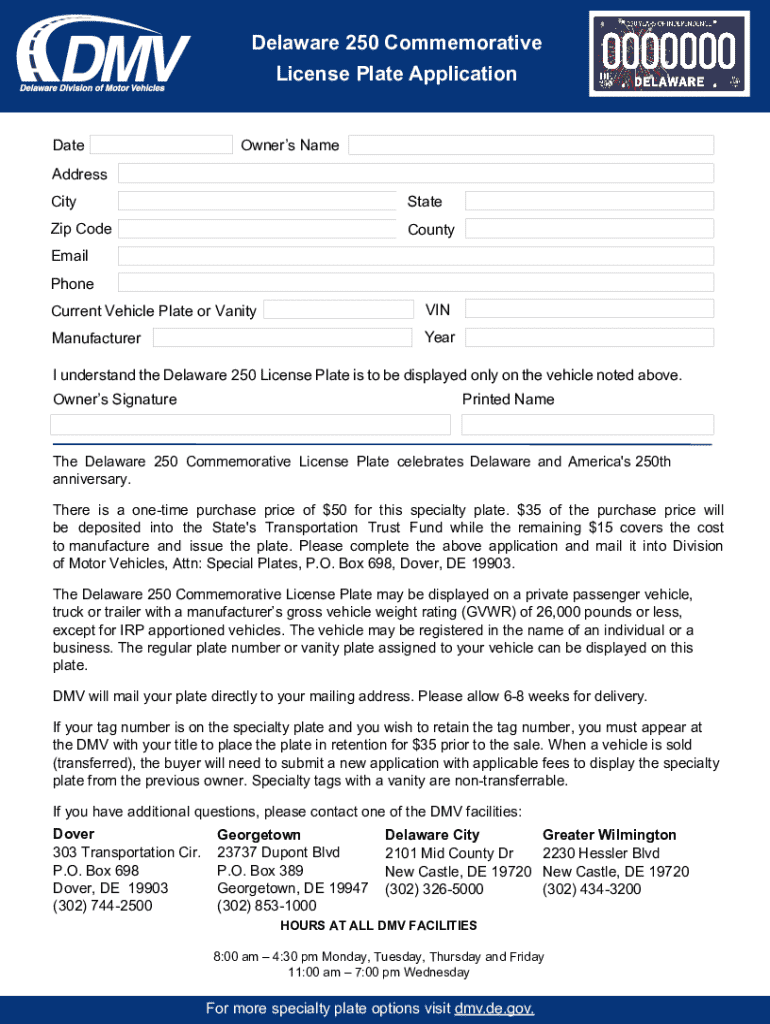 There is typically no specific deadline for applying for the Delaware 250 Commemorative License. However, it's essential to check with the Delaware DMV for any announcements about special periods related to commemorative plates.