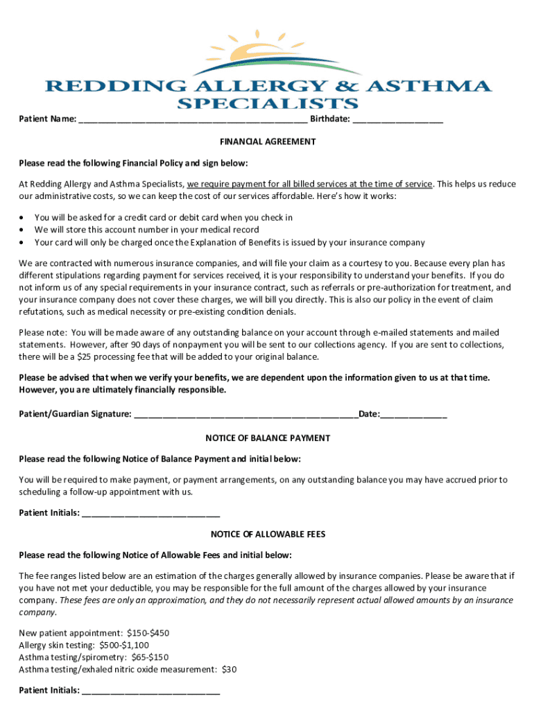 The Redding Allergy Financial Agreement serves as a crucial tool for managing allergy treatment costs. It outlines financial responsibilities, ensuring clarity for patients engaging in allergy care. Understanding this agreement is vital for patients, as it helps them navigate the complexities of treatment expenses and insurance interactions effectively.