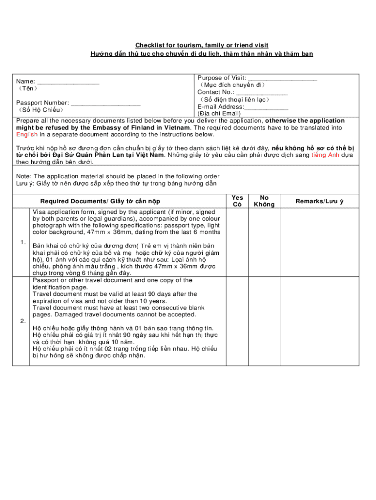 The Finland Visa Application Checklist is a document used by individuals applying for a visa to Finland to ensure they have all required materials prepared and organized.