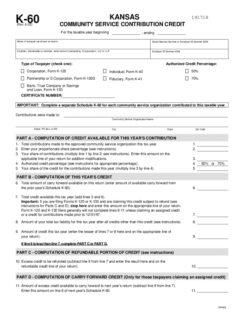 Get the free Kansas Community Service Contribution Credit Form K-60