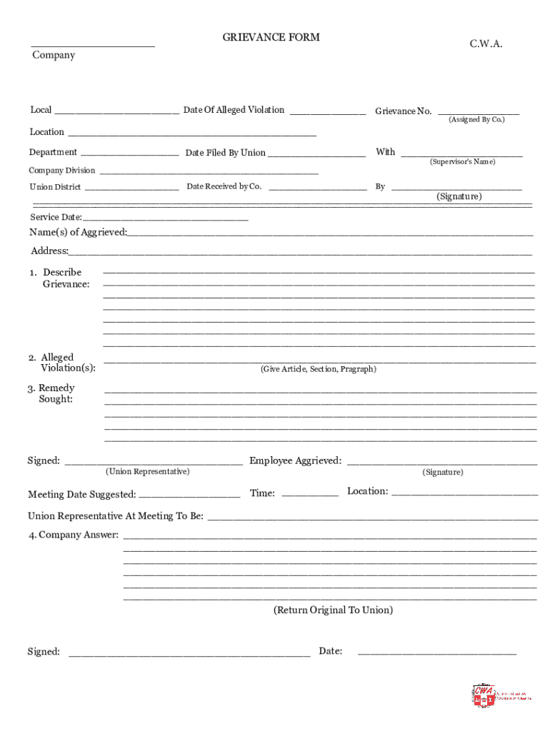 The CWA Grievance Form is intended for union members who are facing workplace-related issues that need formal reporting or resolution.