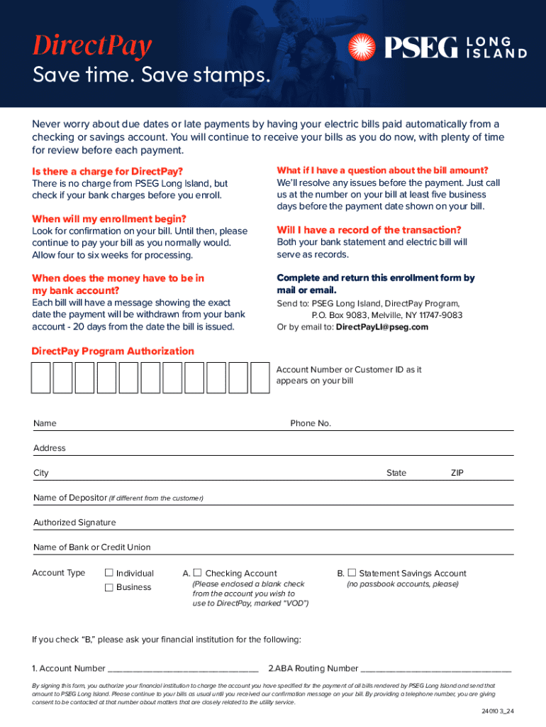 The PSEG Long Island DirectPay is available for residential and commercial customers who have an active account with PSEG Long Island. Eligibility typically requires you to be the account holder.