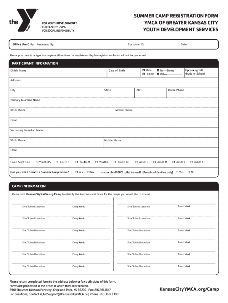 The YMCA summer camp registration must be filled out by parents or guardians of children wishing to attend the camp. Specific age limits may apply, as the camp is designed to cater to a range of age groups, ensuring appropriate activities and supervision. It is essential for those in charge of the child’s care to provide accurate information during registration.