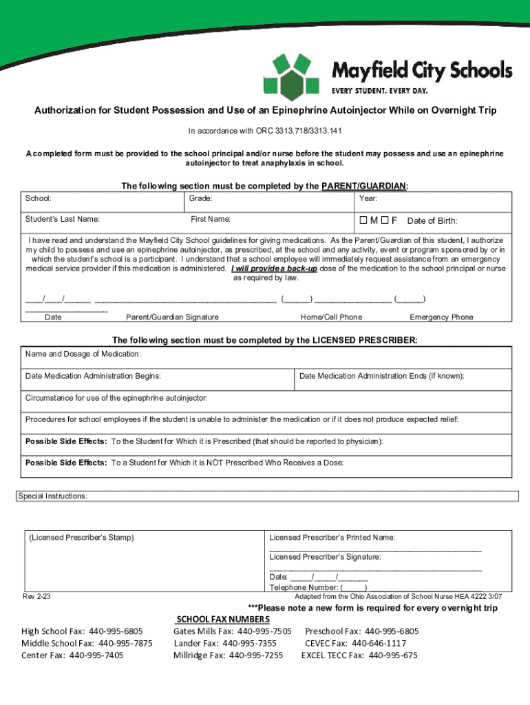 A completed sample of the Authorization for Student Epinephrine can serve as a valuable reference. This example illustrates key sections of the form: