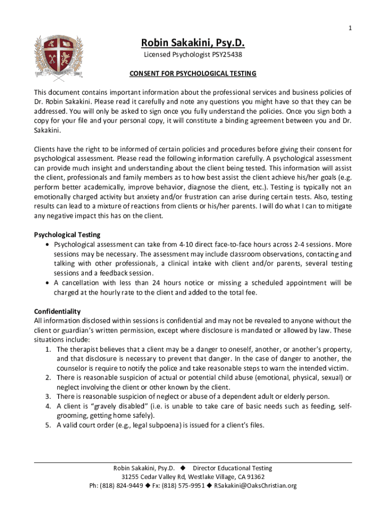 Get the free Consent for Psychological Testing
