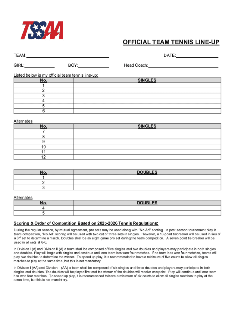 The primary users of the official team tennis line-up include coaches, team managers, and players themselves. Various organizations, such as local leagues and state federations, may require this documentation for compliance with tournament regulations. Additionally, specific age groups or competitive levels might have distinct requirements, making awareness essential for effective participation.