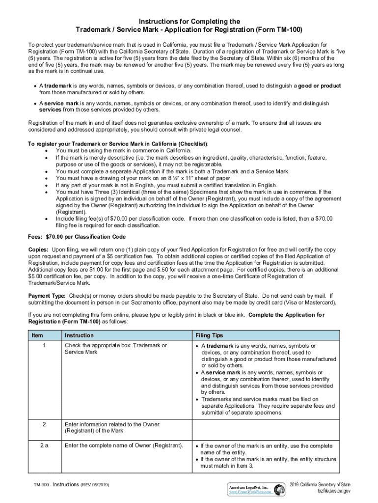 Get the free Trademark Service Mark Application for Registration (Form TM-100)