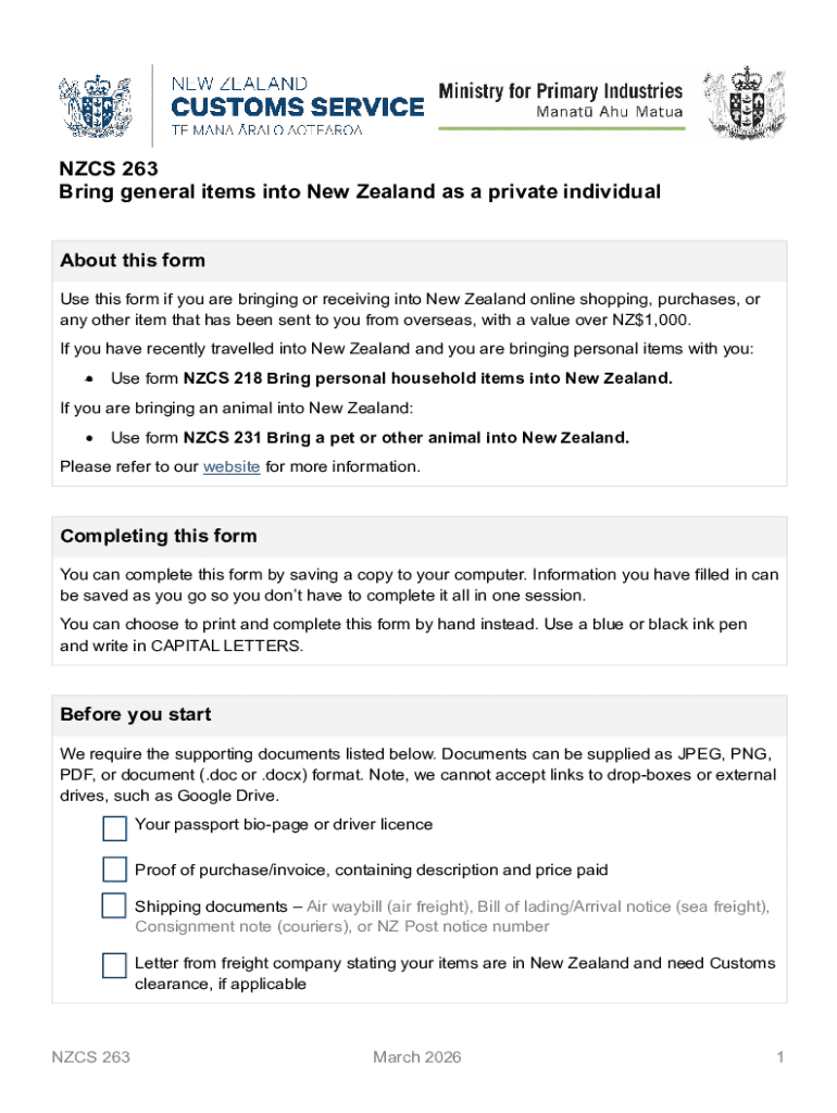 The NZCS 263 Form is an essential document used in various contexts, primarily relating to customs and importation processes in New Zealand. It serves as a compliance tool to ensure that necessary declarations are made when goods are imported or exported. Understanding what the NZCS 263 Form entails is crucial for individuals and businesses involved in international trade.