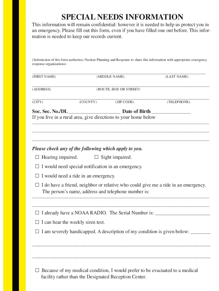 The special needs information form can be filled out by parents, guardians, or caregivers of individuals with special needs who require assistance or services.