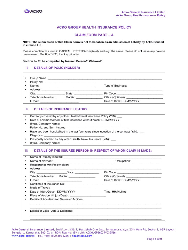 The Acko Group Health Insurance is a financial document used by individuals and families to apply for health insurance coverage provided by Acko.