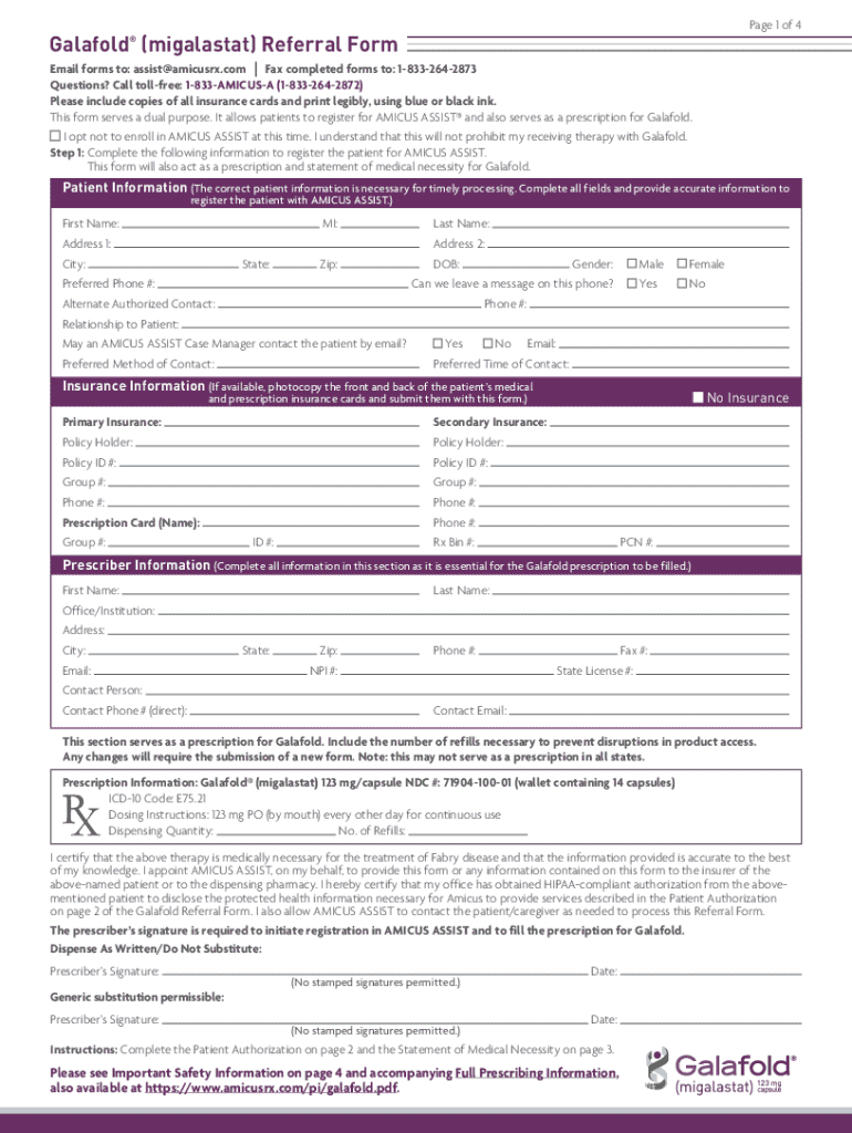 The Galafold Referral Form is an essential document used by healthcare professionals to refer patients for treatment with Galafold, a medication for Fabry disease.