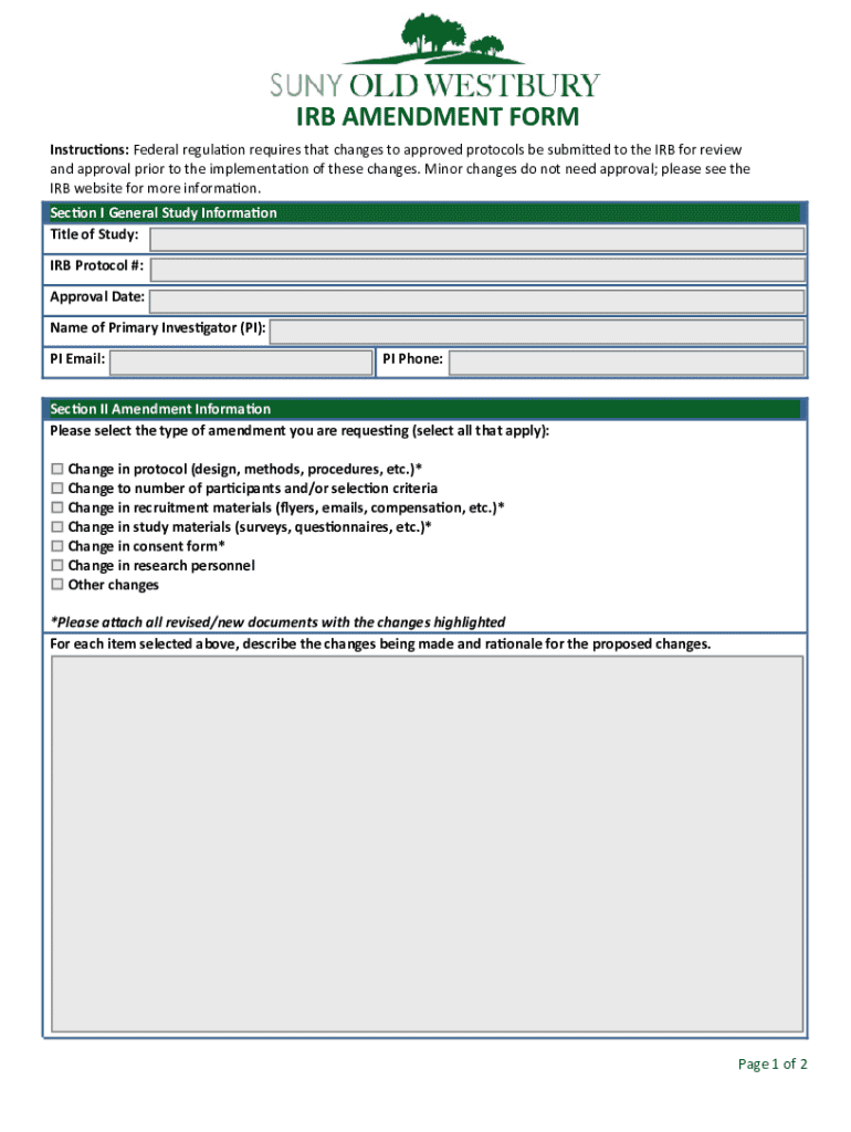 The IRB Amendment Form is designed for researchers and students who hold approval for prior research studies involving human subjects and need to amend their protocols for compliance.