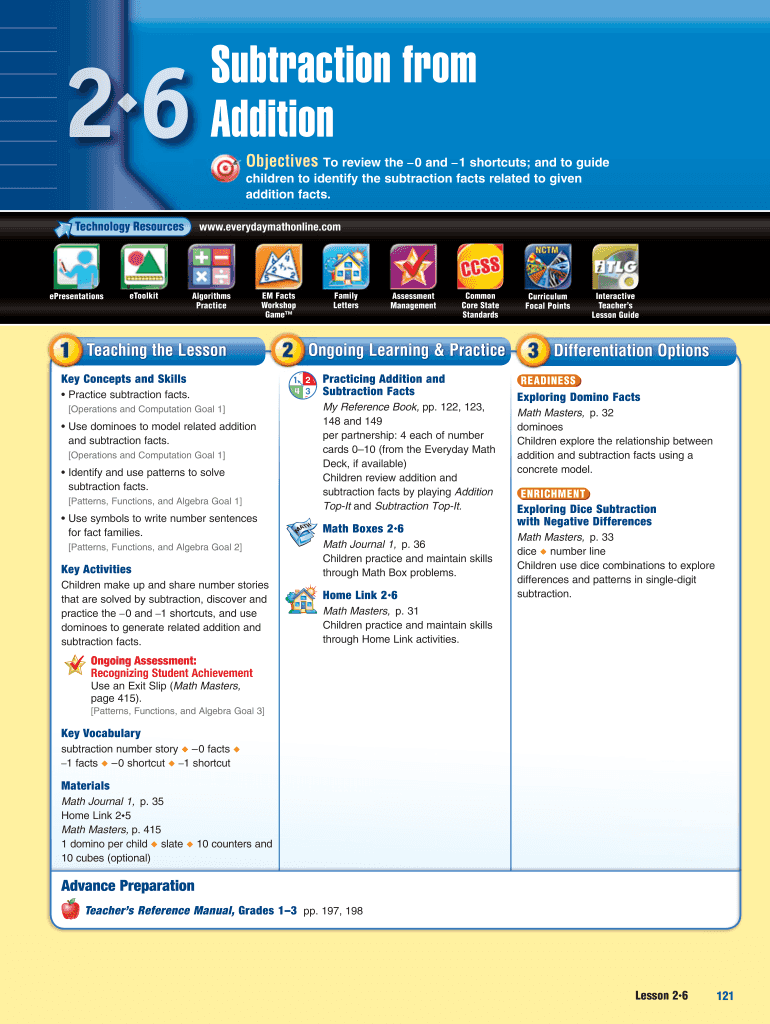 Subtraction from AdditionObjectives To review the 0 and 1 shortcuts; and to guide children to identify the subtraction facts related to given c addition facts.www.everydaymathonline.comePresentationseToolkitAlgorithms