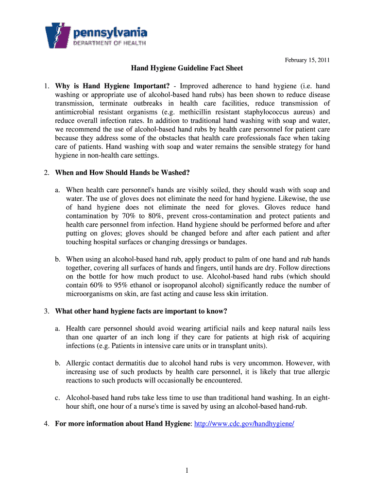 February 15, 2011Hand Hygiene Guideline Fact Sheet 1. Why is Hand Hygiene Important? Improved adherence to hand hygiene (i.e. handwashing or appropriate use of alcohol based hand rubs) has been shown