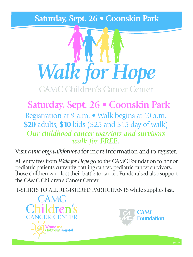 Saturday, Sept. 26 Coonskin Park Walk for Hope CAME Children's Cancer Center Saturday, Sept. 26 Coonskin Park Registration at 9 a.m. Walk begins at 10 a.m. $20 adults, $10 kids ($25 and $15 day of