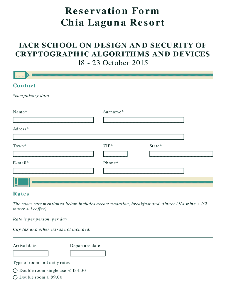 Reservation Form Chia Laguna Resort IAC SCHOOL ON DESIGN AND SECURITY OF CRYPTOGRAPHIC ALGORITHMS AND DEVICES 18 23 October 2015 Contact *compulsory data Name* Surname* Address* Town* ZIP* Email*