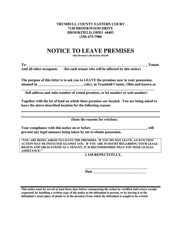 TRUMBULL COUNTY EASTERN COURT 7130 LOCKWOOD DRIVE BROOKFIELD, OHIO 44403 (330) 6757900 NOTICE TO LEAVE PREMISES Ohio Revised Code Section 1923.04 To:, Tenant And all other occupants (list each tenant