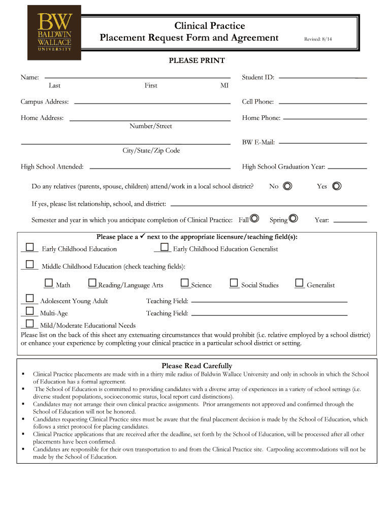 Clinical Practice Placement Request Form and Agreement Revised: 8/14 PLEASE PRINT Name: Last First Student ID: MI Campus Address: Cell Phone: Home Address: Home Phone: Number/Street BWE Mail: City/State/Zip