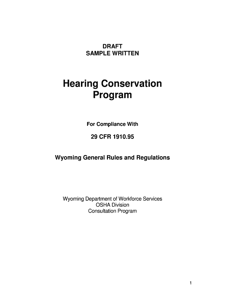 DRAFT SAMPLE WRITTEN Hearing Conservation Program For Compliance With 29 CFR 1910.95 Wyoming General Rules and Regulations Wyoming Department of Workforce Services OSHA Division Consultation Program