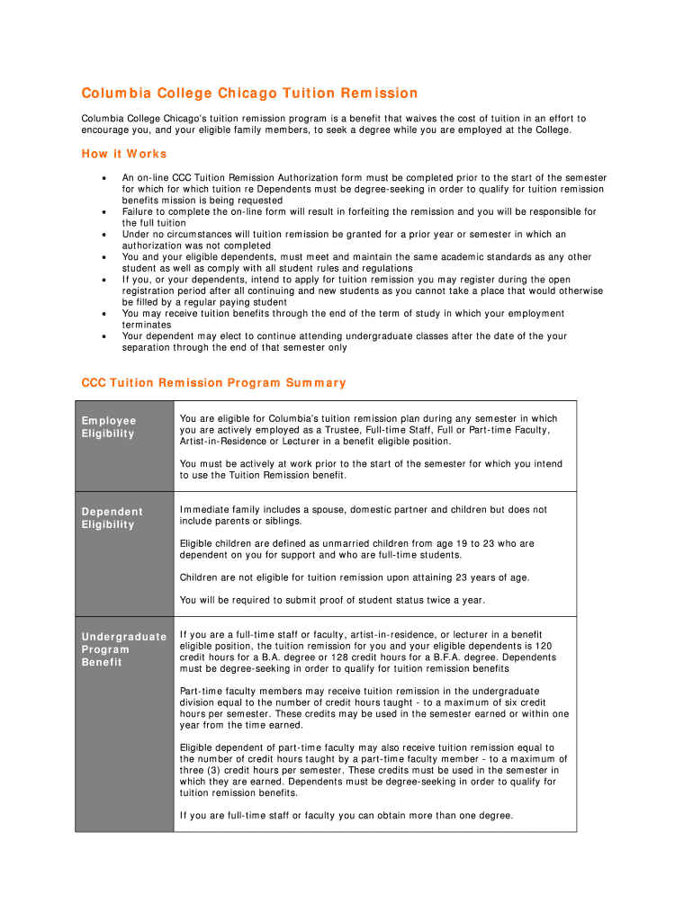 Get the free Columbia College Chicago Tuition Remission - about colum