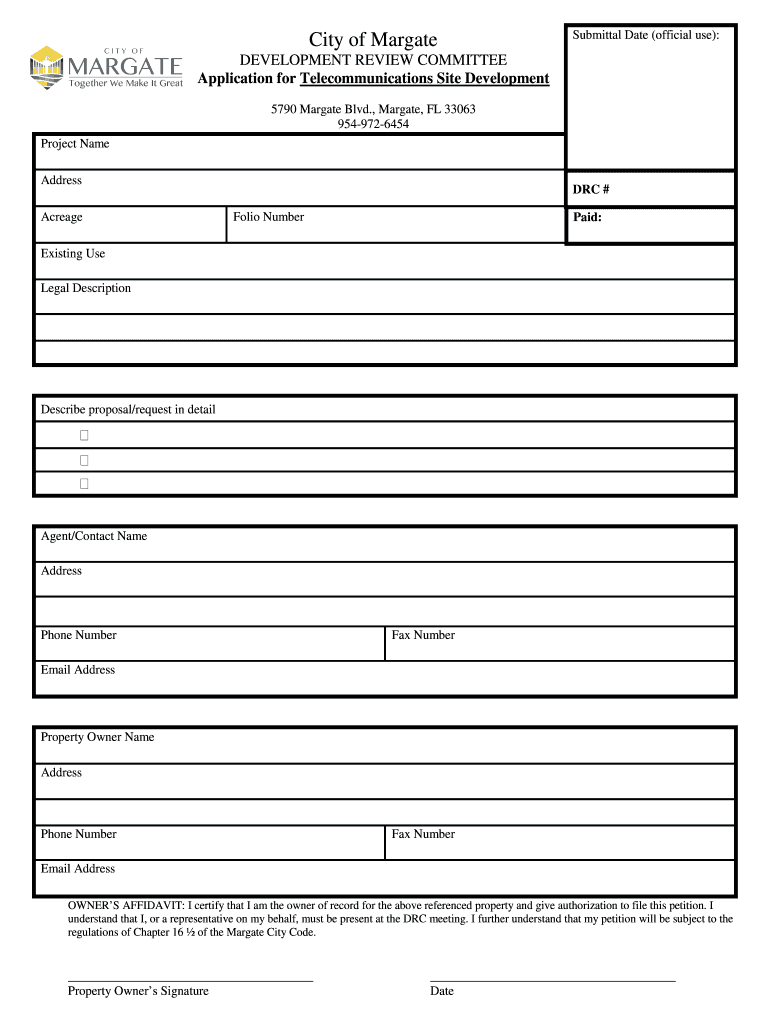 City of Margate Submittal Date (official use): DEVELOPMENT REVIEW COMMITTEE Application for Telecommunications Site Development 5790 Margate Blvd., Margate, FL 33063 9549726454 Project Name Address