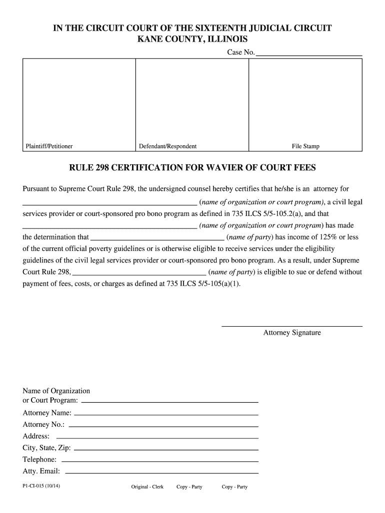 IN THE CIRCUIT COURT OF THE SIXTEENTH JUDICIAL CIRCUIT KANE COUNTY, ILLINOIS Case No. Plaintiff/Petitioner Defendant/Respondent File Stamp RULE 298 CERTIFICATION FOR WAVIER OF COURT FEES Pursuant