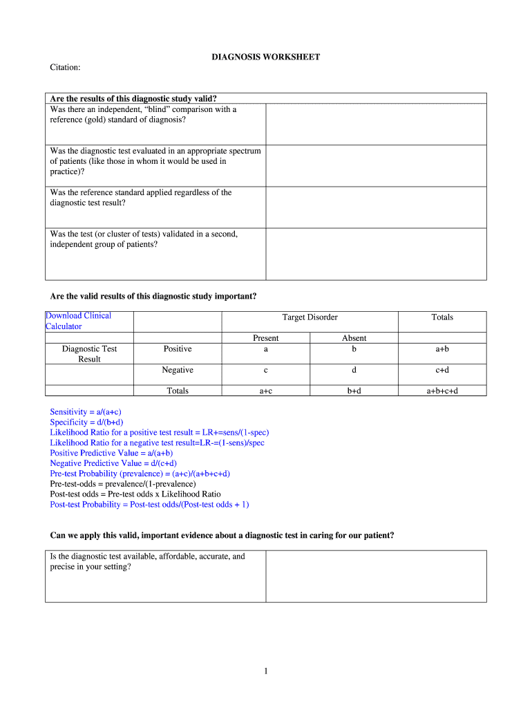 DIAGNOSIS WORKSHEET. Citation: Are the results of this diagnostic study valid? Was there an independent, blind comparison with a reference (gold)...