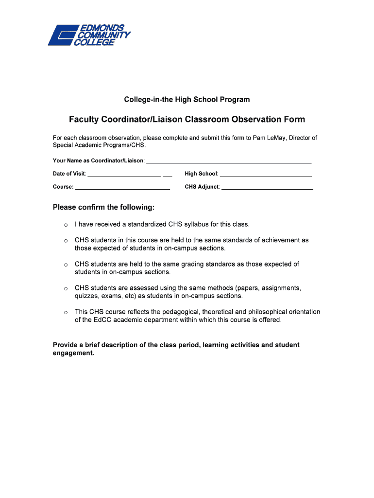 Collegiate High School Program Faculty Coordinator/Liaison Classroom Observation Form For each classroom observation, please complete and submit this form to Pam Le May, Director of Special Academic