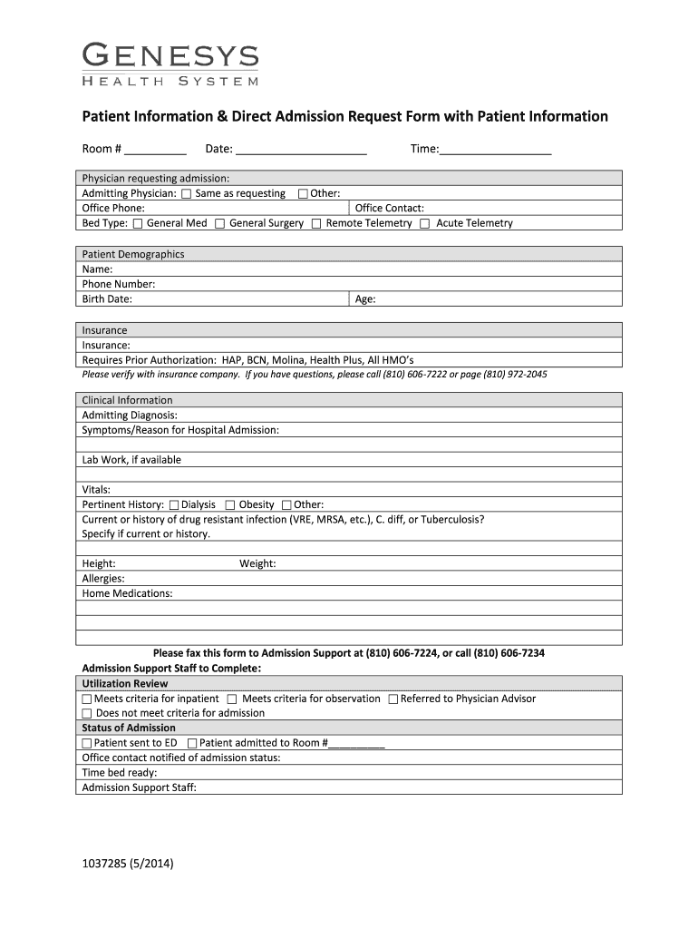 Patient Information & Direct Admission Request Form with Patient Information Room # Date: Time: Physician requesting admission: Admitting Physician: Same as requesting Other: Office Phone: Office