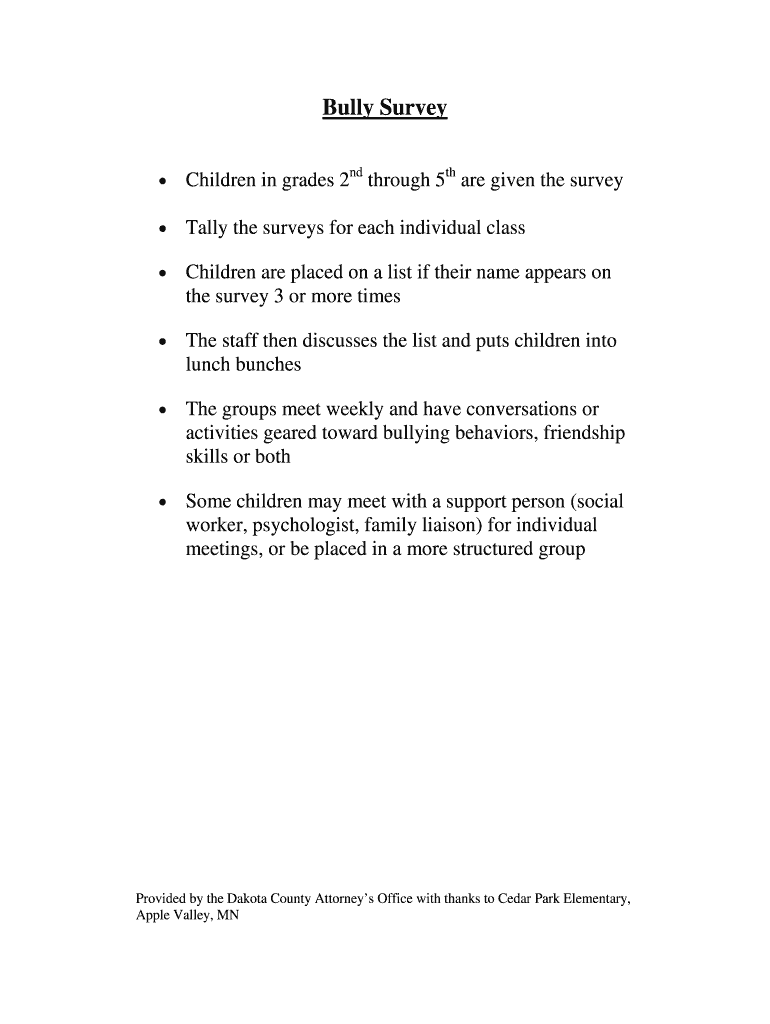 Additionally, the survey might inquire about the resources and support that were available to you in dealing with the bullying incident. Remember to mention any counseling services, helplines, or other forms of assistance provided to you.