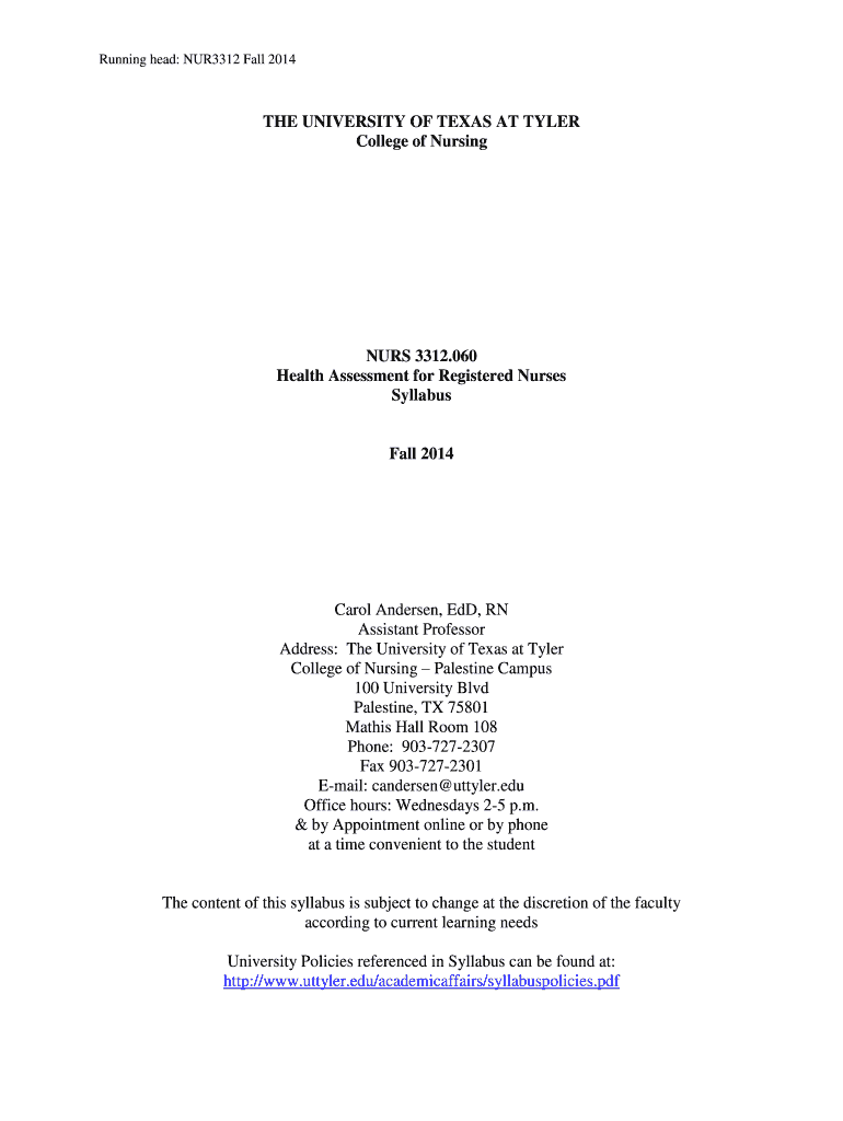 Running head: NUR3312 Fall 2014THE UNIVERSITY OF TEXAS AT TYLER College of NursingNURS 3312.060 Health Assessment for Registered Nurses SyllabusFall 2014Carol Andersen, EDD, RN Assistant Professor